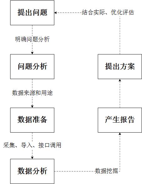 利用大數據進行分析,大致是需要六個過程,提出問題——問題分析——數據準備——數據分析——產生報告——提出方案,大數據分析,主要是圍繞這六個進行開展。
