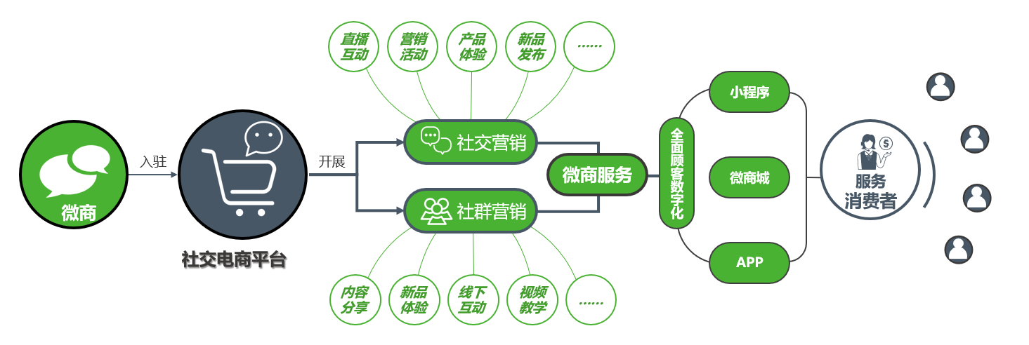 通過社交電商平臺,直播互動、營銷活動、內容分享、產品體驗、線下互動等營銷渠道,線上下單,線下就近配送原則,同時系統的開放新接口為擴展多渠道提供便利。